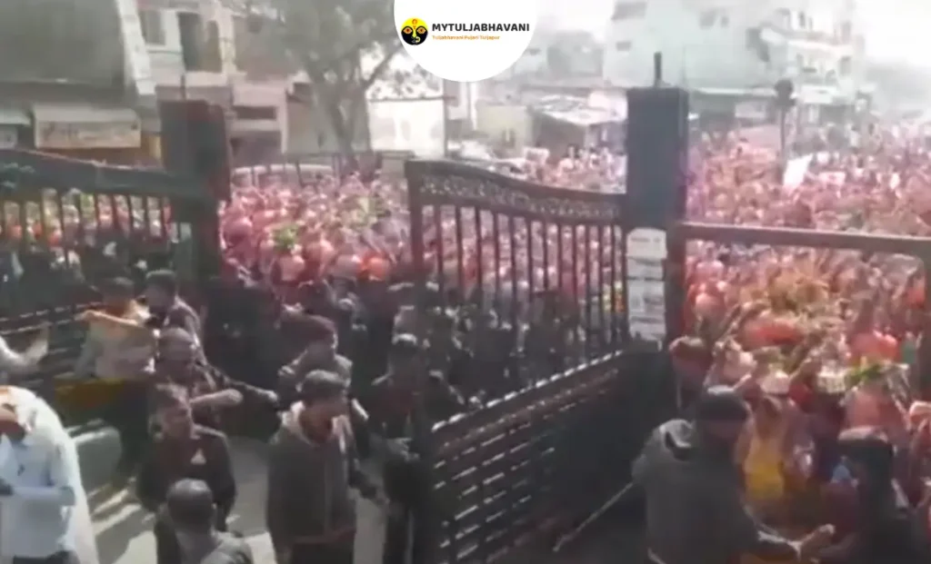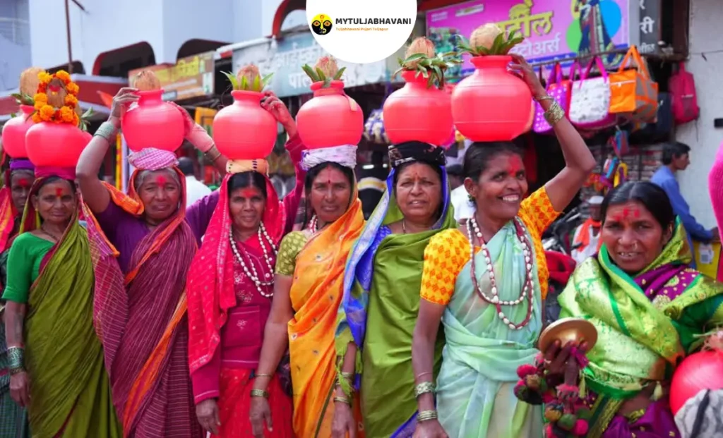 The procession (Miravnuk) reaches the temple of Goddess Tulja Bhavani with great devotion. All the women are offered Jal in the Garbhagruha of Mother Bhavani.
